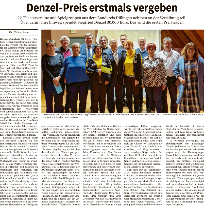 Die Siegfried und Elfriede Denzel-Stiftung unterstützt die kulturelle Arbeit der Theatergruppen im Landkreis Dillingen mit einer großzügigen finanziellen Unterstützung. So können im Laufe von zehn Jahren jeweils 3.000 Euro jährlich als Denzel-Theaterpreis an Theatergruppen aus dem Landkreis ausgeschüttet werden.
